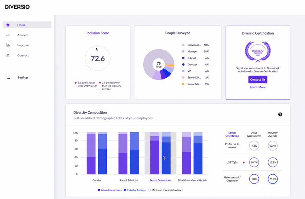 - Benchmark & analyze. It’s not enough to know who works at your company. How are you doing compared to the competition in your industry? What do those numbers mean? Using a resource like Diversio’s Recommendation Engine™, for example, lets you transform data into actionable recommended actions so you can see your diversity metrics improve over time.